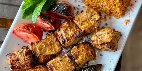 The Tavuk Şiş, Chicken Shish is a marinated grilled chicken breast served with rice, bulgur, cucumber sauce, grilled tomato, and pepper. It sounds so simple, but the flavors are bold and lively. Although the actual spices remain a secret, the fragrant essences of coriander and paprika shine through in these dishes that are as vibrant on the plate as they are on the palate.